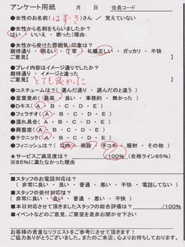 蓋を開けてみたら、はっきり言って期待の新人さんでした(笑)心から楽しんでいるすけべなプレイの数々。人当たりの良い性格。高得点を連発するアンケート!ちょっとどうかなぁ?なんて疑ってしまった自分を説教したいです。とにもかくにも一度遊んでみて下さい。きっと良かったよ~。そう言ってもらえること間違いなしです!