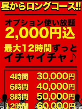 オールタイム受付可能!お昼間もロングコース承ります!お気に入りのあの子とホテルに入る前に日中デートも♪恋人気分MAX間違いなし!!昼夜問わず、最長12時間も外出デートや添い寝、プレイが楽しめちゃうんです!なんとオプション使い放題!【2000円も込み!!】でごわすっ♪たっぷり楽しんじゃいましょう♪今までは時間がなくて諦めていた夢を叶える大チャンスですよ!12時間60,000円