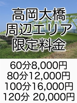 高岡市の高岡大橋エリア限定! ナナナナント!60分がたった8,000円! 1万円払っても2,000円もお釣りが返ってきちゃいます! 高岡駅からでも車で10分程度の場所ですので、 ぜひぜひご活用ください! 【高岡大橋エリア限定コース】 60分8,000円 80分12,000円 100分16,000円 120分20,000円 以降+20分4,000円