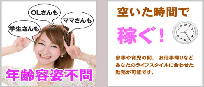 | 待遇 | 罰金、ノルマ一切なし、マンション寮完備、託児所あり、送りあり、1日体験入店歓迎、制服貸与 |