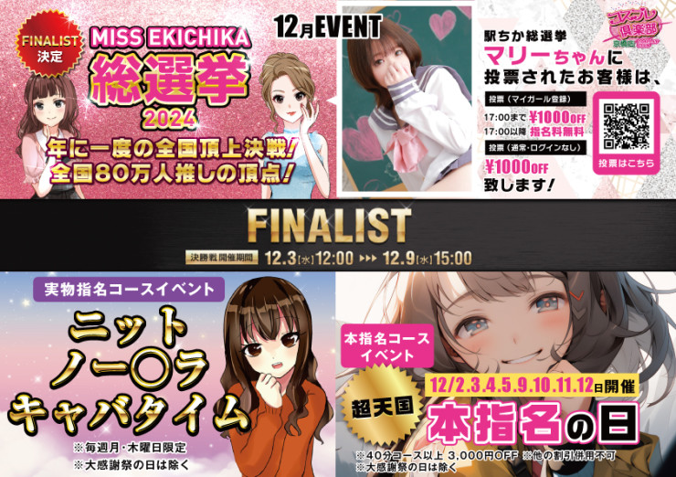 本格シュチュエーションであなたの好みの女性をイチャイチャ 楽しく会話しながらお遊びいただけます。 TOPクラスの可愛い女の子達が本格コスチュームで皆様をお出迎え致します。 名物の実物指名でさらにお楽しみください! 毎月、イベント開催中! | |
